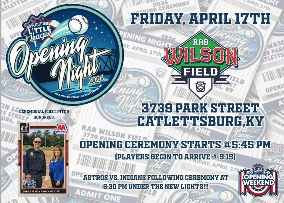 Opening Night Ceremony Friday, April 17, 2026 5:45 PM 7:00 PM Catlettsburg City Park Park Street Catlettsburg, KY, 41129 United States (map) Google Calendar ICS